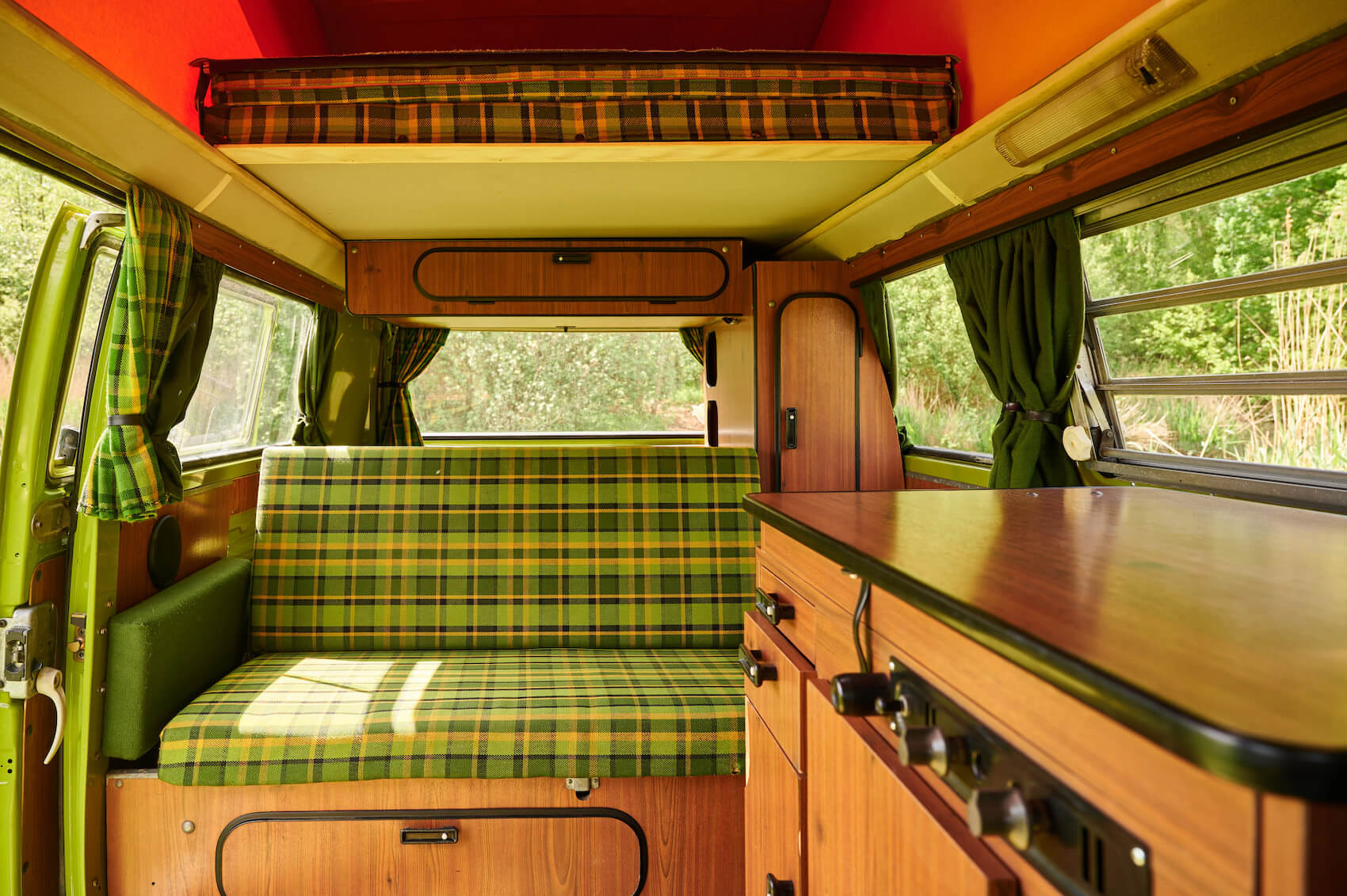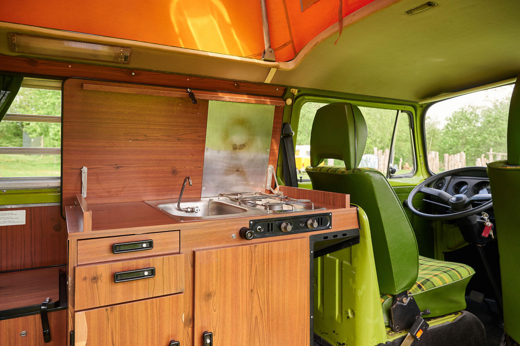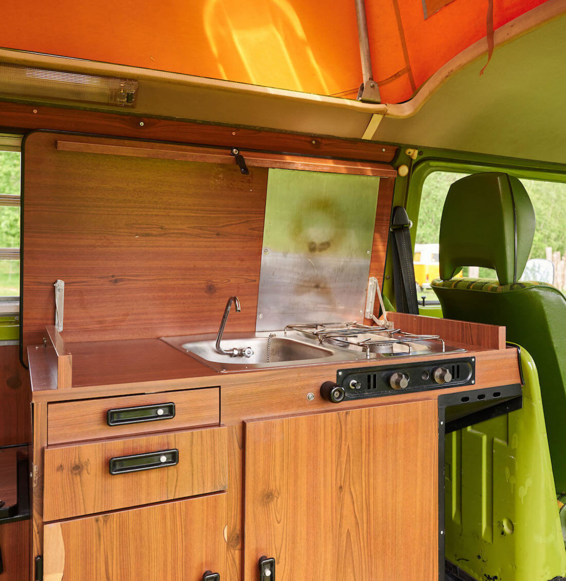 Het authentieke Westfalia Berlin interieur is de voorloper van de kenmerkende buscamper inrichting en is nog altijd tiptop in orde. De volledige kampeerinrichting bevindt zich zijwaarts aan de bestuurderskant en is van alle benodigdheden voorzien. Het keukenblok is o.a. ingericht met een: